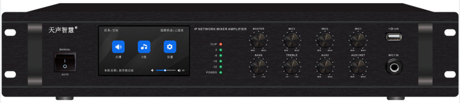 鋁質2U黑色拉絲面闆機櫃式安裝,採用Linux系統, 4.3英寸彩色觸(chù)摸屏顯示,工業級觸(chù)摸操作方式實現人機互動,觸(chù)控手感靈敏; 具備(bèi)本地U盤播放功能,順序播放模式,播放完後自動(dòng)停止;支持多種操作方式(播放、暫停、選歌、上一曲、下一曲、音量調(diào)節);DSP軟件音頻解碼方案,實現網絡(luò)化傳(chuán)輸16位立體聲CD音質的音頻信号,内置嵌入式網絡(luò)音頻解碼模塊(kuài),支持TCP/IPUDPRTP協(xié)議,接收平台指令和音頻(pín)信号,支持平台遠程升級;遠程控制本地音量, 内置DC24V電源輸出,用於強切4線制音控器;短路信号輸入,通過軟件設置可觸發本機報警;短路信号觸發輸出,用於(yú)驅動其它聯動設備;支持狀态回傳,可将本機播放、工作狀态回傳至平台;支持平台對本機遠程升級功能;支持平台對本機分區、分組廣播功能; 散熱風扇採(cǎi)用智能溫度控制啓動本地音量控制器採(cǎi)用全密封式防塵(chén)工藝,永久防塵(chén)。15KVESD保護,内置網絡隔離防雷處(chù)理電路。採(cǎi)用D類數字功放電(diàn)路,适應寬(kuān)電(diàn)壓AC100V-240V供電(diàn),高效足功率輸出直接驅動(dòng)定壓70V-100V、定阻4-16Ω廣播揚聲器。